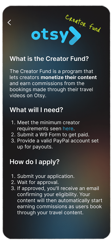 The creator fund is a program Otsy provides that enables creators to earn money on our platform. We want to enable creator’s to monetize and earn from the travel other’s are booking through you, the creator!